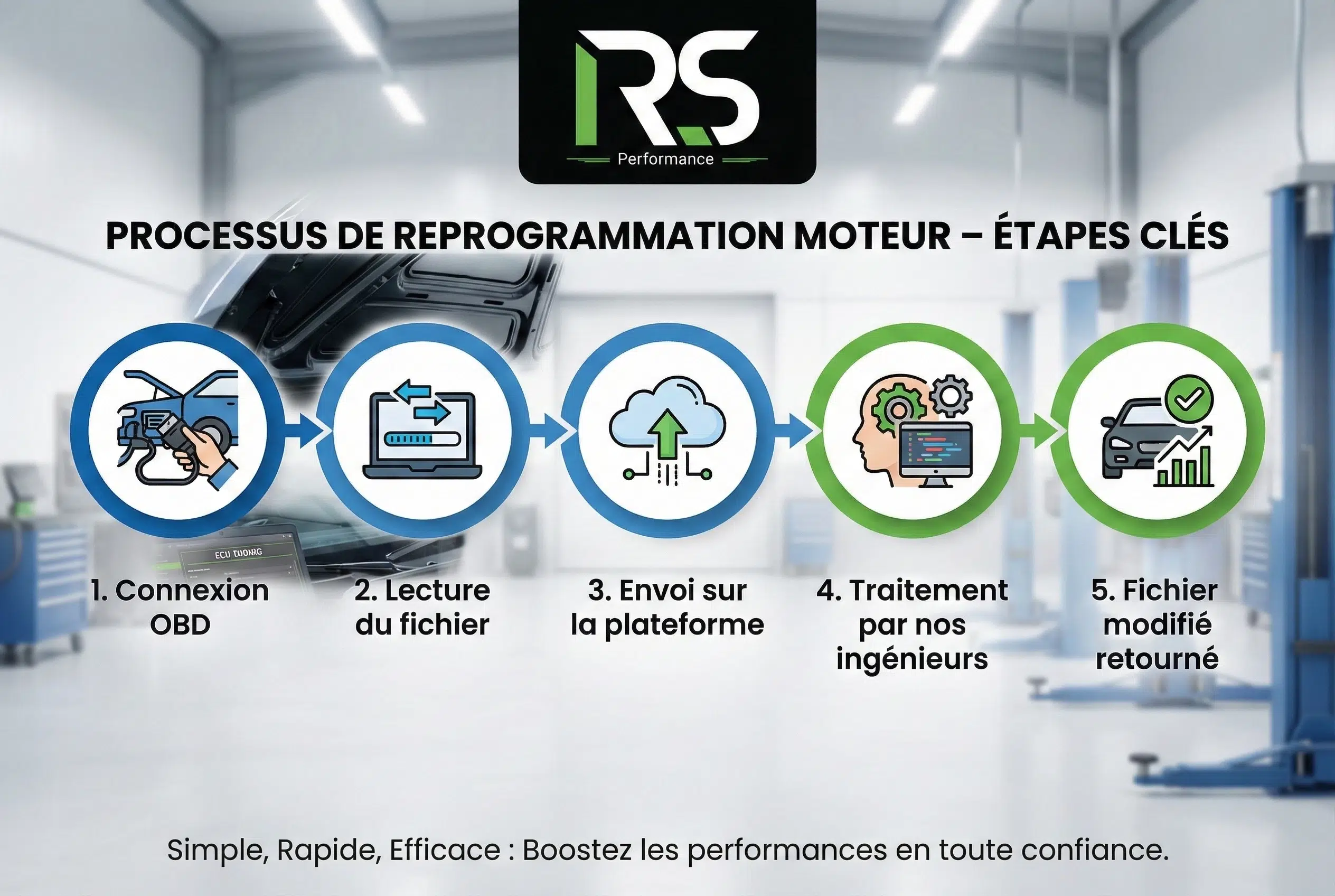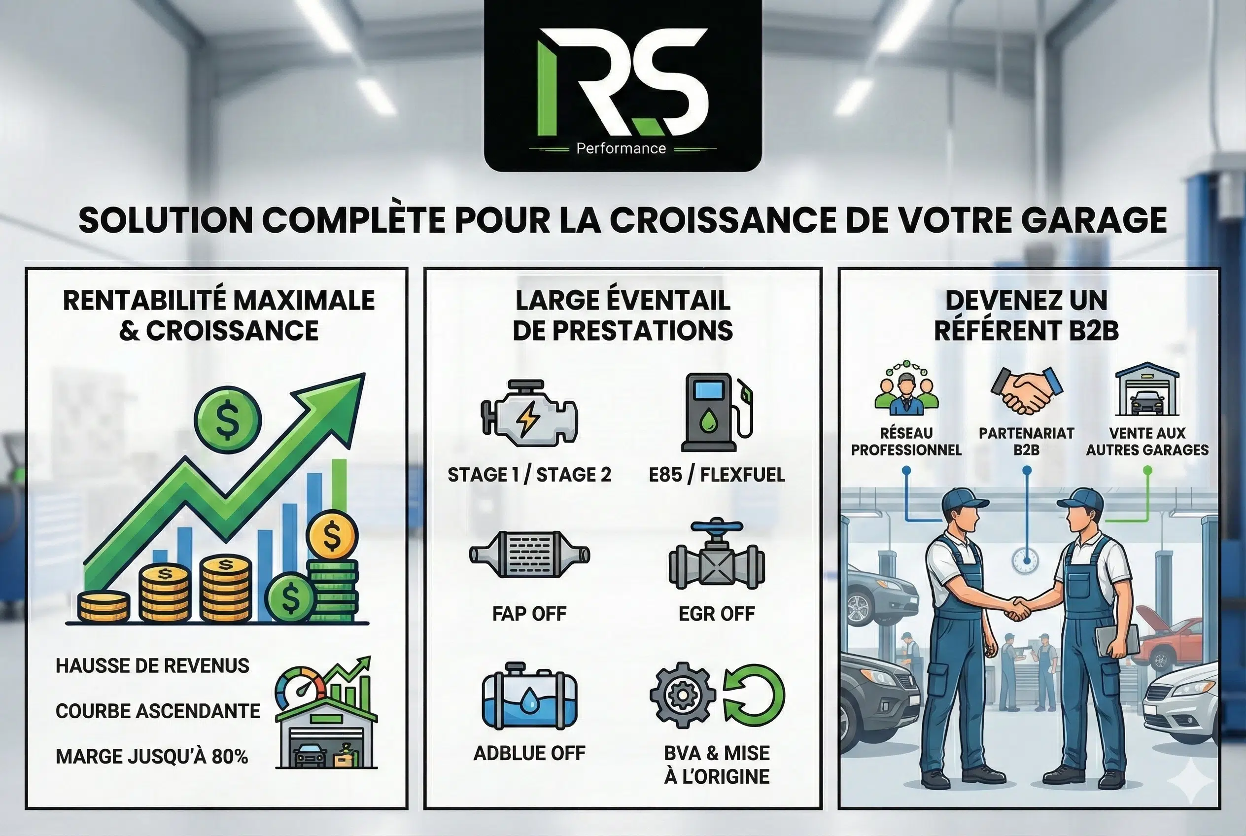 RS Performance propose un service complet de reprogrammation moteur clé en main dédié aux garages et aux professionnels de l’automobile.